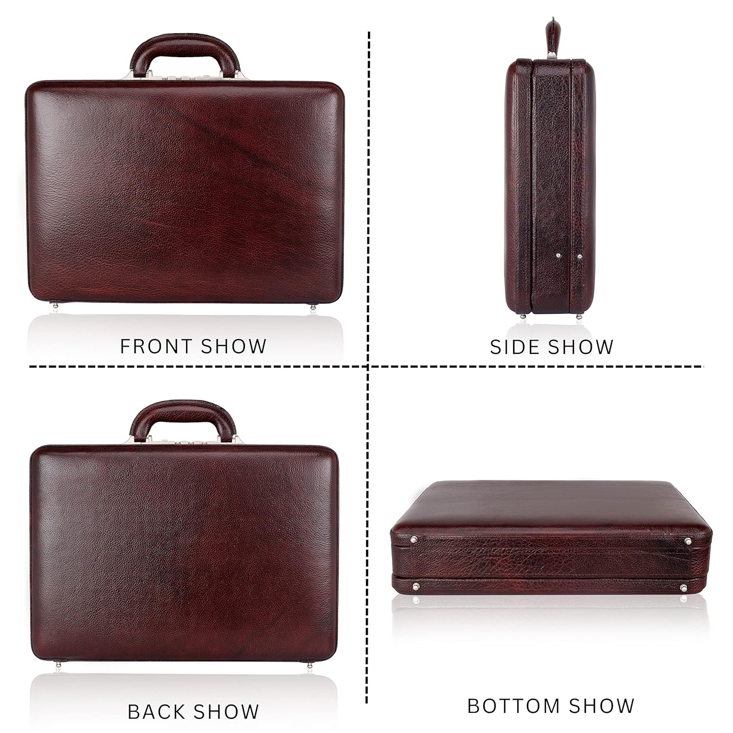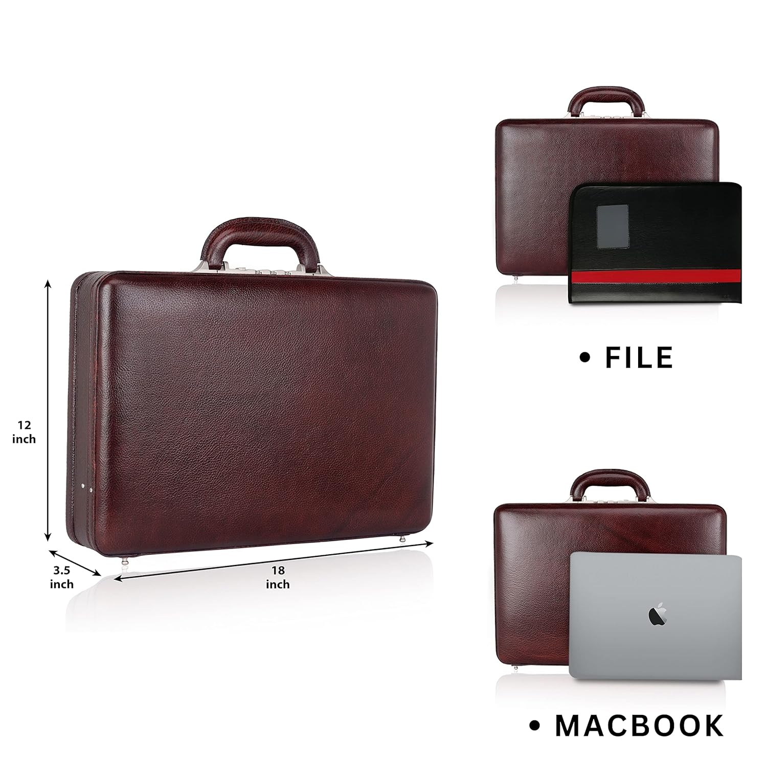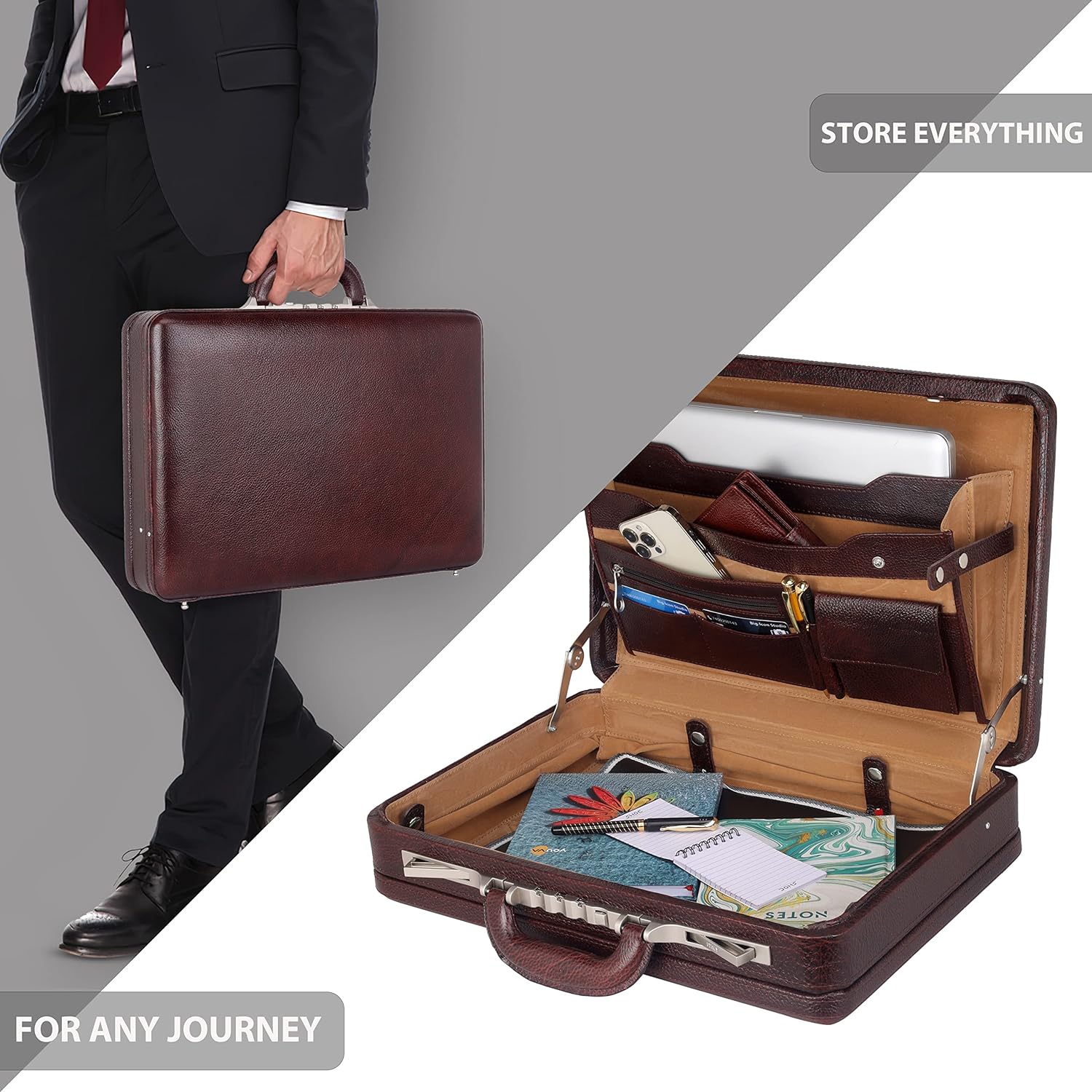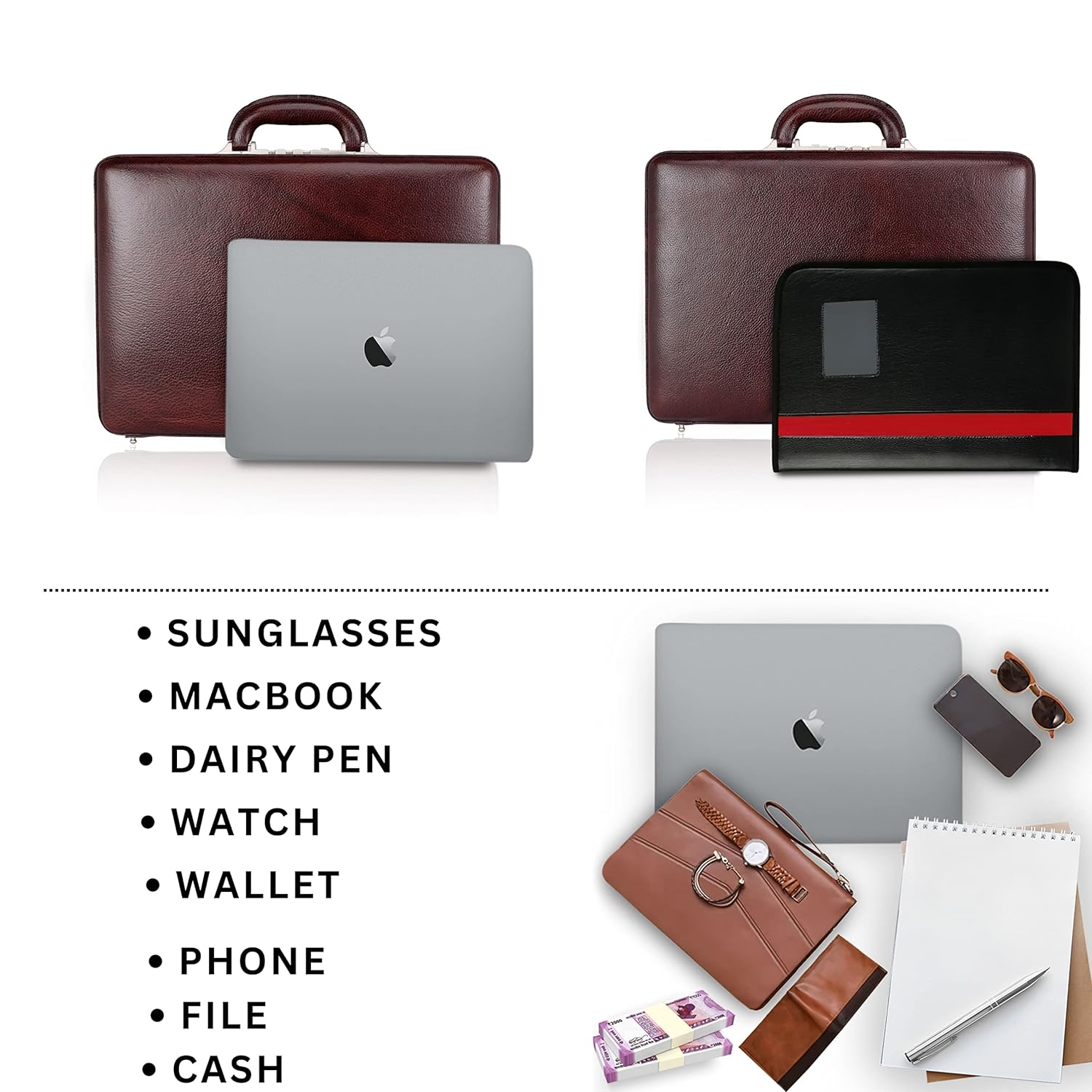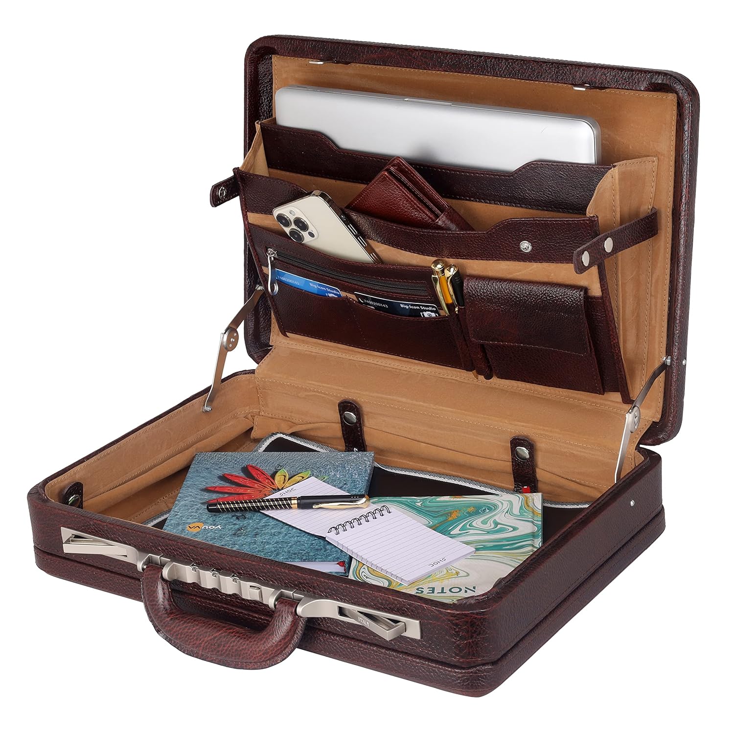 Crafted for professionals who value timeless design and flawless organisation, the Clifton Genuine Leather Executive Briefcase blends heritage craftsmanship with modern functionality. Every inch of this masterpiece is made from premium full-grain leather, carefully hand-finished to deliver a smooth, polished texture that matures beautifully over time. Inside, the luxurious suede-finish lining protects your valuable belongings while adding a refined touch of sophistication. The Italian-engineered metal lock system not only ensures uncompromised security but also enhances the briefcase’s executive appeal. Its rigid hard-shell structure keeps your documents crisp, your laptop safe, and your office essentials perfectly in place — no matter where business takes you. Thoughtfully designed compartments provide smart organization for your laptop, files, pens, cards, charger, and other accessories, ensuring everything you need is at your fingertips. The fold-open design allows quick access during meetings or travel check-ins, while the ergonomic handle ensures a comfortable grip during long commutes. Whether you’re attending an important client meeting, travelling for business, or leading a courtroom session, the Clifton Leather Briefcase is a mark of prestige and confidence. It’s not just a bag — it’s a reflection of your professional success and classic taste.